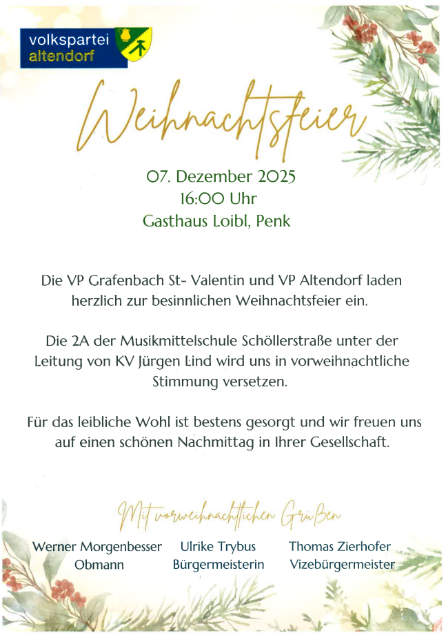 Anmeldungen werden ab sofort bis einschließlich 9. Dezember 2025 im Gemeindeamt Altendorf entgegengenommen. Gerne können sich auch Teilnehmer aus anderen Gemeinden anmelden.
