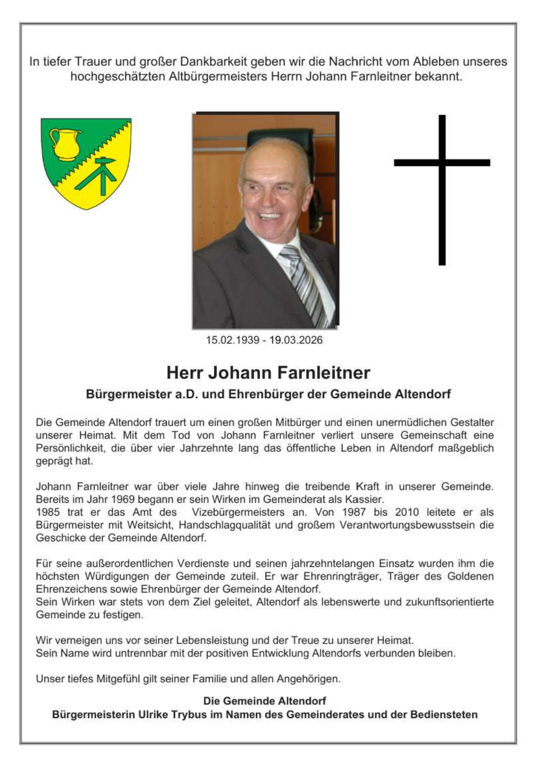 Wir nehmen Abschied von Johann Farnleitner, Bürgermeister außer Dienst, der durch sein jahrzehntelanges Engagement