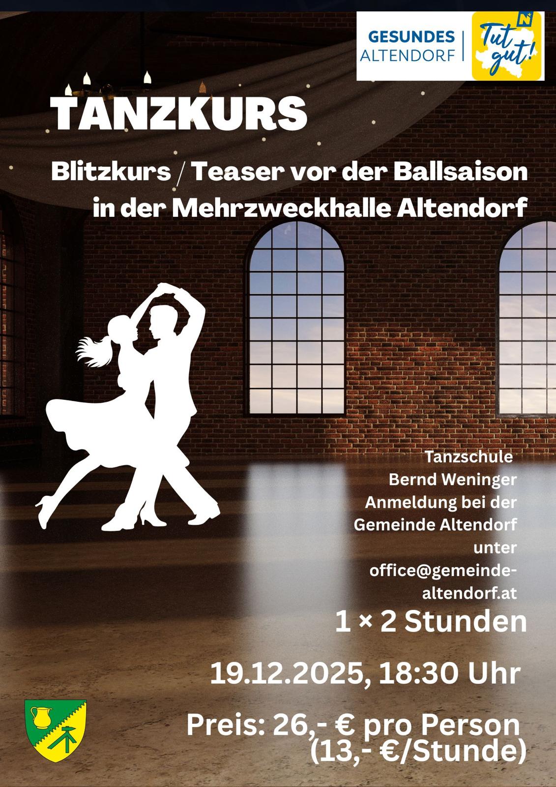 Am 19. Dezember um 18:30 Uhr findet in der Mehrzweckhalle Altendorf ein schwungvoller Blitz-Tanzkurs statt – perfekt als kurzer Teaser für alle, die Tanzen ausprobieren möchten.